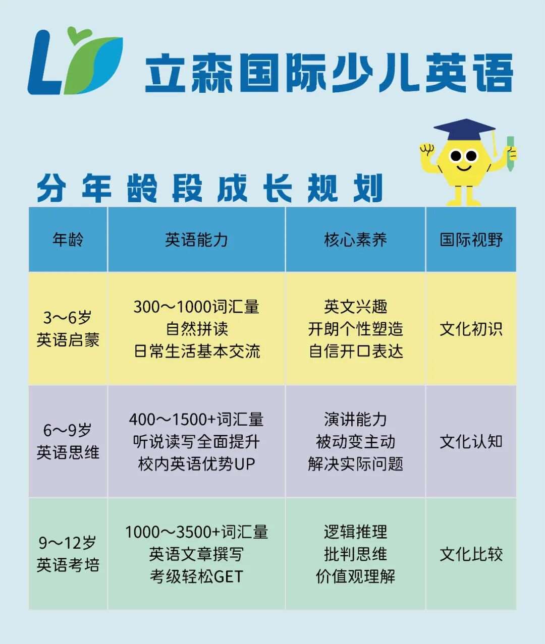 武汉立森国际少儿成长中心专注于 3-12 岁少儿综合素质培养,始终以 “放眼世界・勇敢表达” 为教育使命。我们摒弃传统填鸭式教学,通过沉浸式场景、互动式体验、国际化课程体系,帮助孩子打破语言壁垒、拓宽全球视野、提升表达能力,同时培养独立思考、团队协作等核心素养,为孩子未来的国际化发展打下坚实基础。